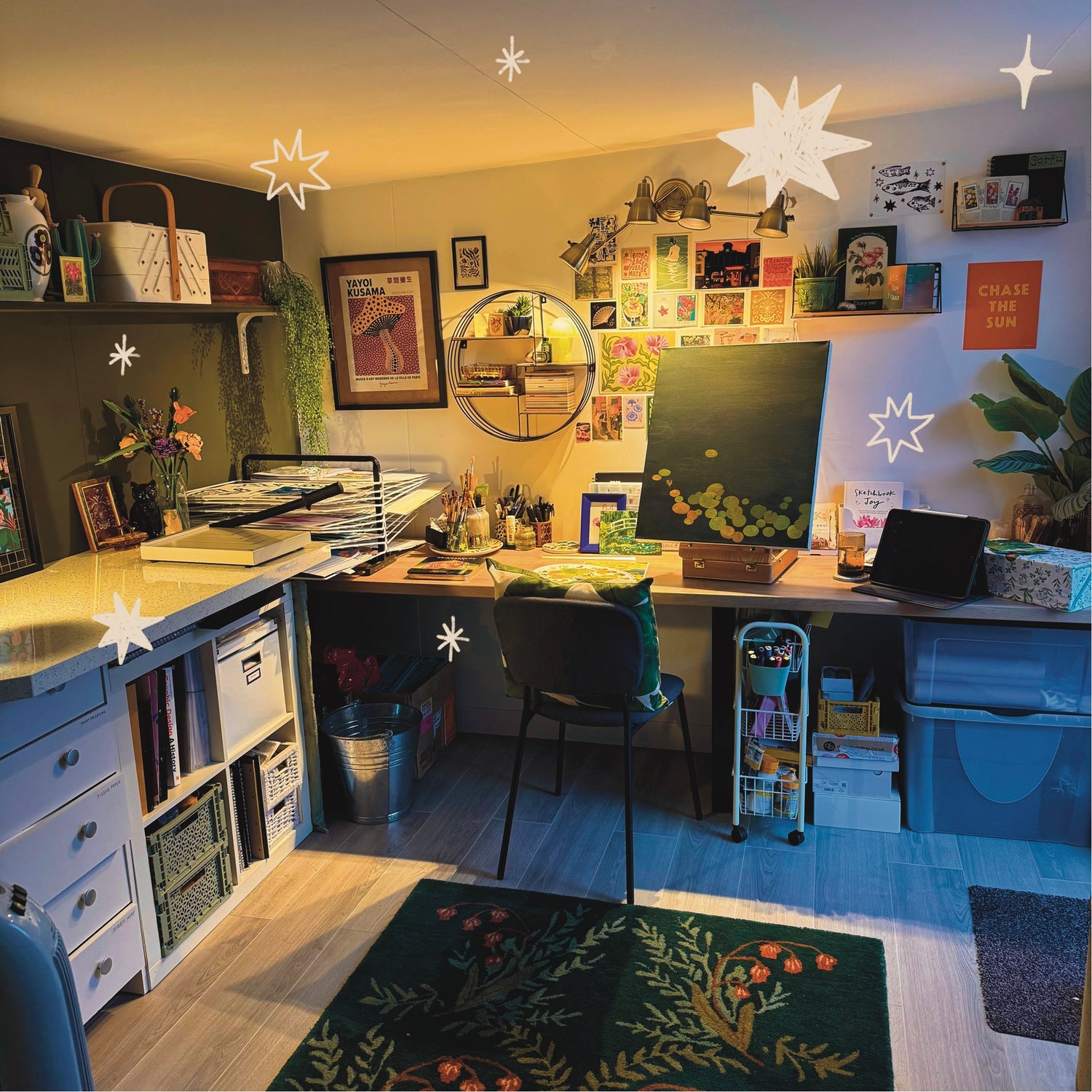 Here’s a glimpse into my home studio in Wivenhoe, Essex. It’s a place that reflects both my process and personality. I wanted my studio to be a mood-board of inspiration, to spark creativity whenever I enter. This is where your prints are created, printed and packaged with care.